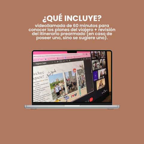 ¿Necesitas ayuda para organizar tu viaje? En una videollamada de 60 minutos respondere tus preguntas y trabajaremos juntos para encontrar la combinación perfecta entre tus presupuestos, tiempos y deseos de viaje para que puedas disfrutar al máximo de tu experiencia en Nueva York.