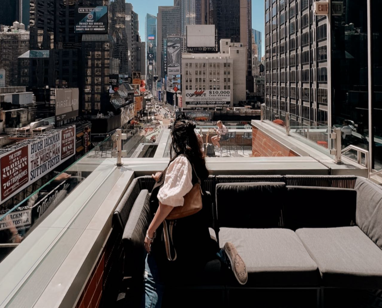 Esta terraza con Times Square en primer plano, cómodos silloncitos, banquetas y binoculares, se encuentra en el Hotel M Social Times Square.